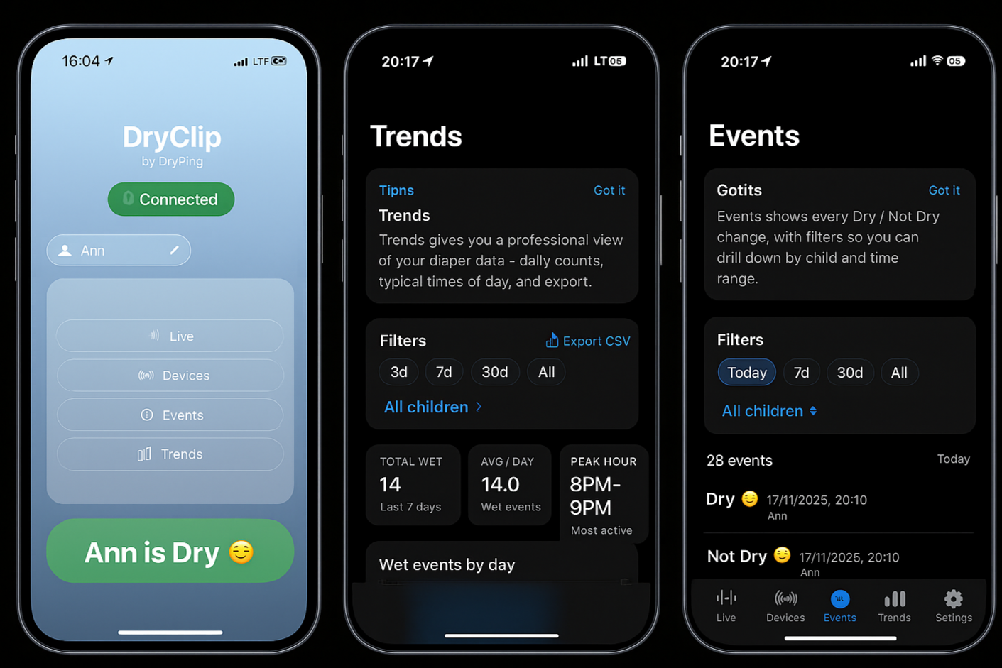 DryClip™ — a premium sensor that detects diaper moisture instantly.